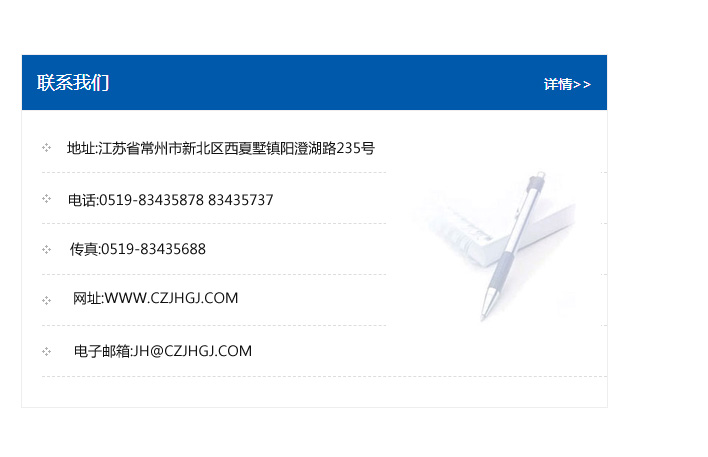 地址:常州市新北區友邦商務大廈1幢16、17層  電話:0519-85101652  傳真:0519-85112595  郵編:213022  網址:www_cz-jiayue_cn.yksyt.com  郵箱:xiajifengaa@163.com